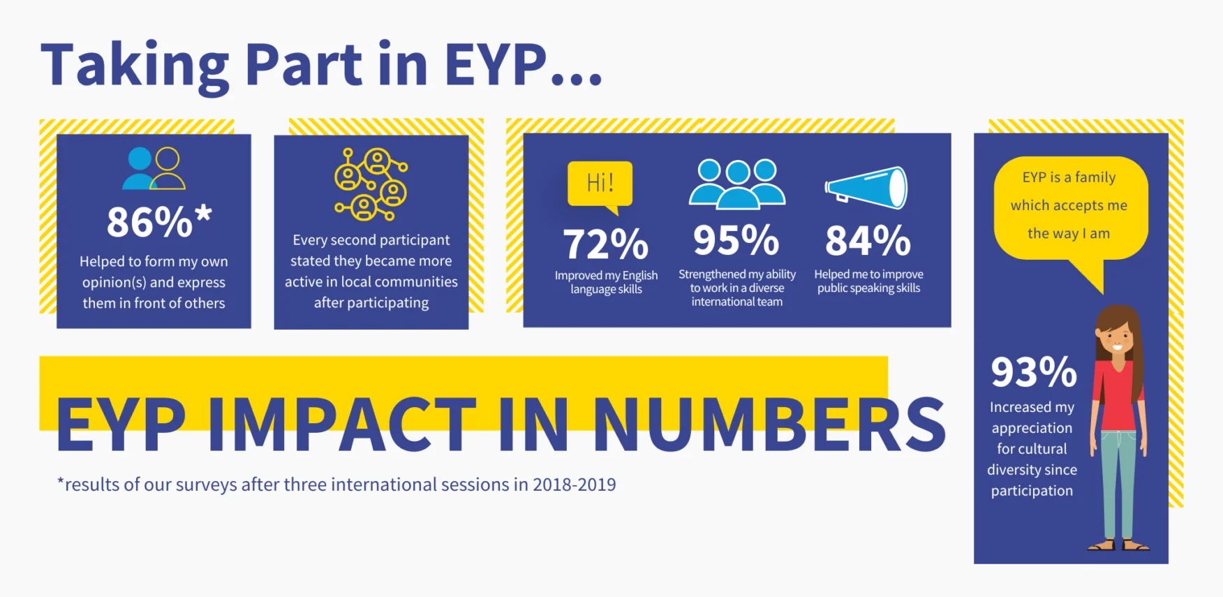 Through our activities, our EYP participants and volunteers are equipped with the knowledge and skills to positively shape the world around them. The EYP network has an open, safe and welcoming environment – run by young people, for young people. Offering a range of non-formal and peer-led educational activities, the EYP provides young people with the space to grow, learn various skills, as well as to take responsibility for themselves and for others. Every year, more than 3500 young volunteers implement EYP activities across Europe, acting as moderators, organisers and facilitators during events. Moreover, it is young people who jointly steer our organisation at large and shape the future of the programme.